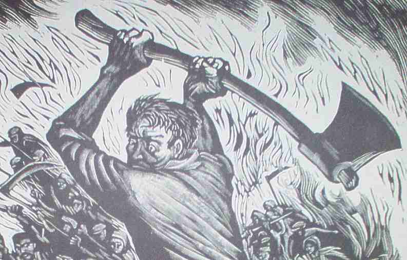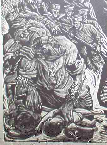 Otro igualmente impresionante es La venganza del pueblo (Homenaje al heroico ejército de guerrilleros yugoslavos) grabado en linóleo en 1942 en el que un hombre enfurecido levanta un hacha sobre los responsables de la guerra teniendo como fondo un paisaje en llamas, pero el que más me conmueve es el El tren. Un soldado nazi abre un vagón y, lámpara en mano, señala a los aterrados judíos conducidos al campo de concentración.